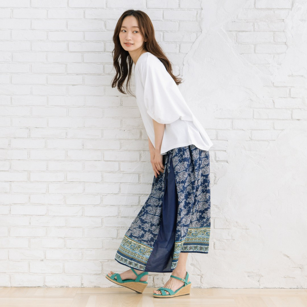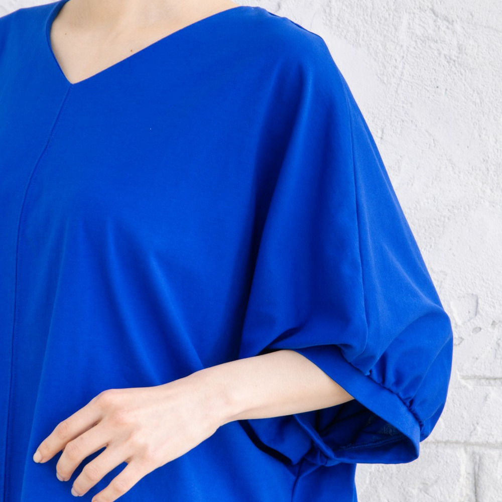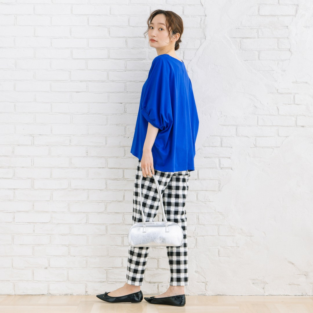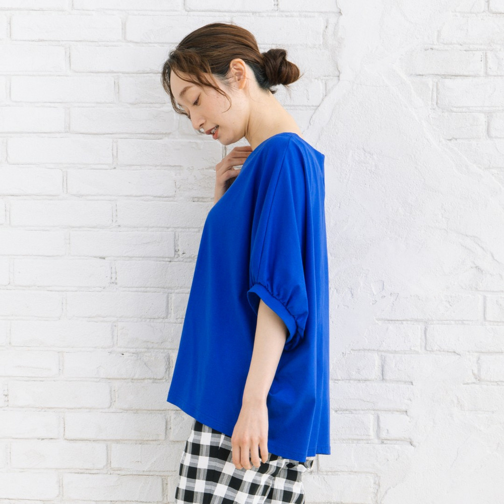 ドルマンスリーブとゆったりした身幅が体のラインを拾いにくく、リラックス感がありながらすっきり見えるのも魅力。