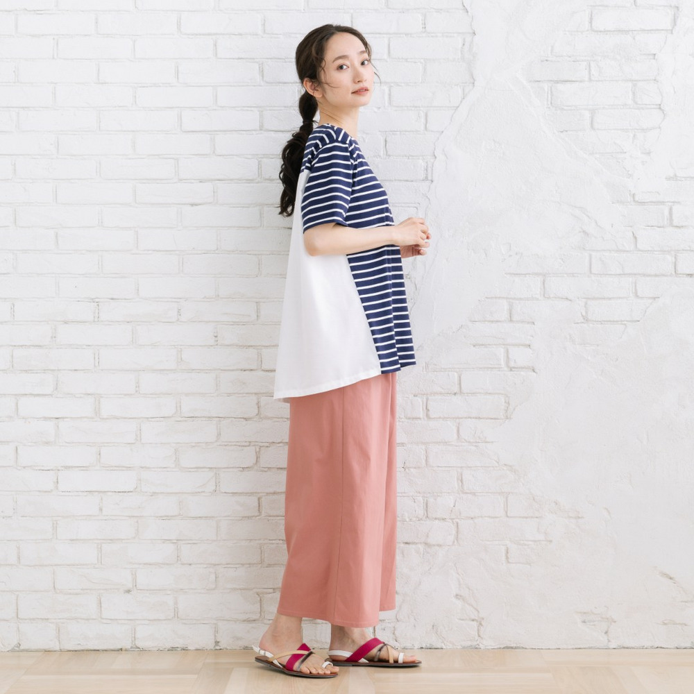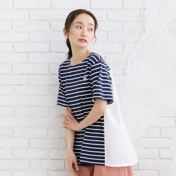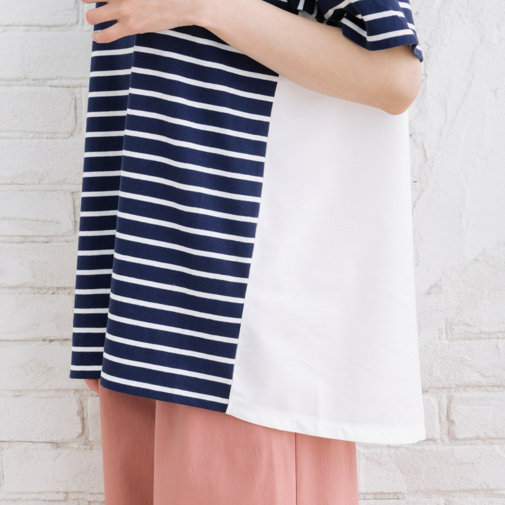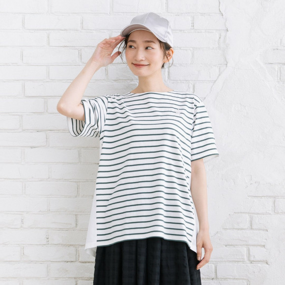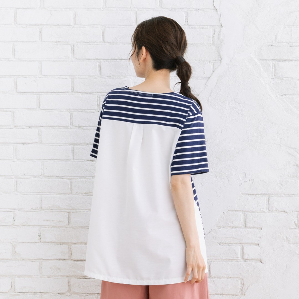 前はボーダーのカットソー、後ろは布帛で切り替えた異素材コンビのカットソー。
