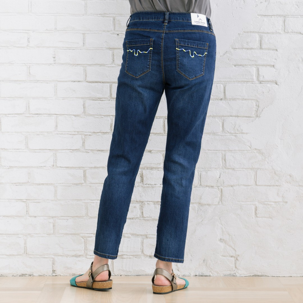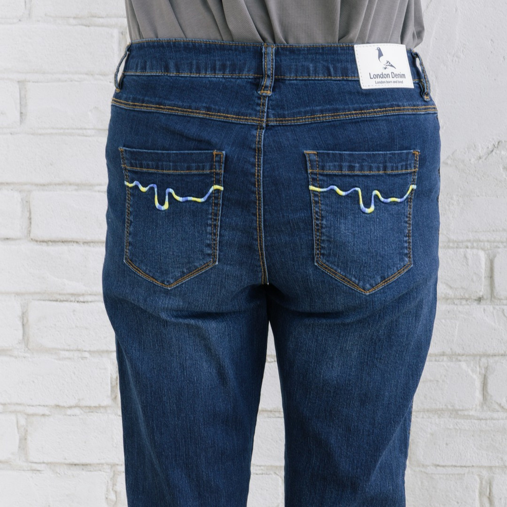 後ろポケットには、テムズ川を形取った刺繍が施してあり、さりげないポイントに。