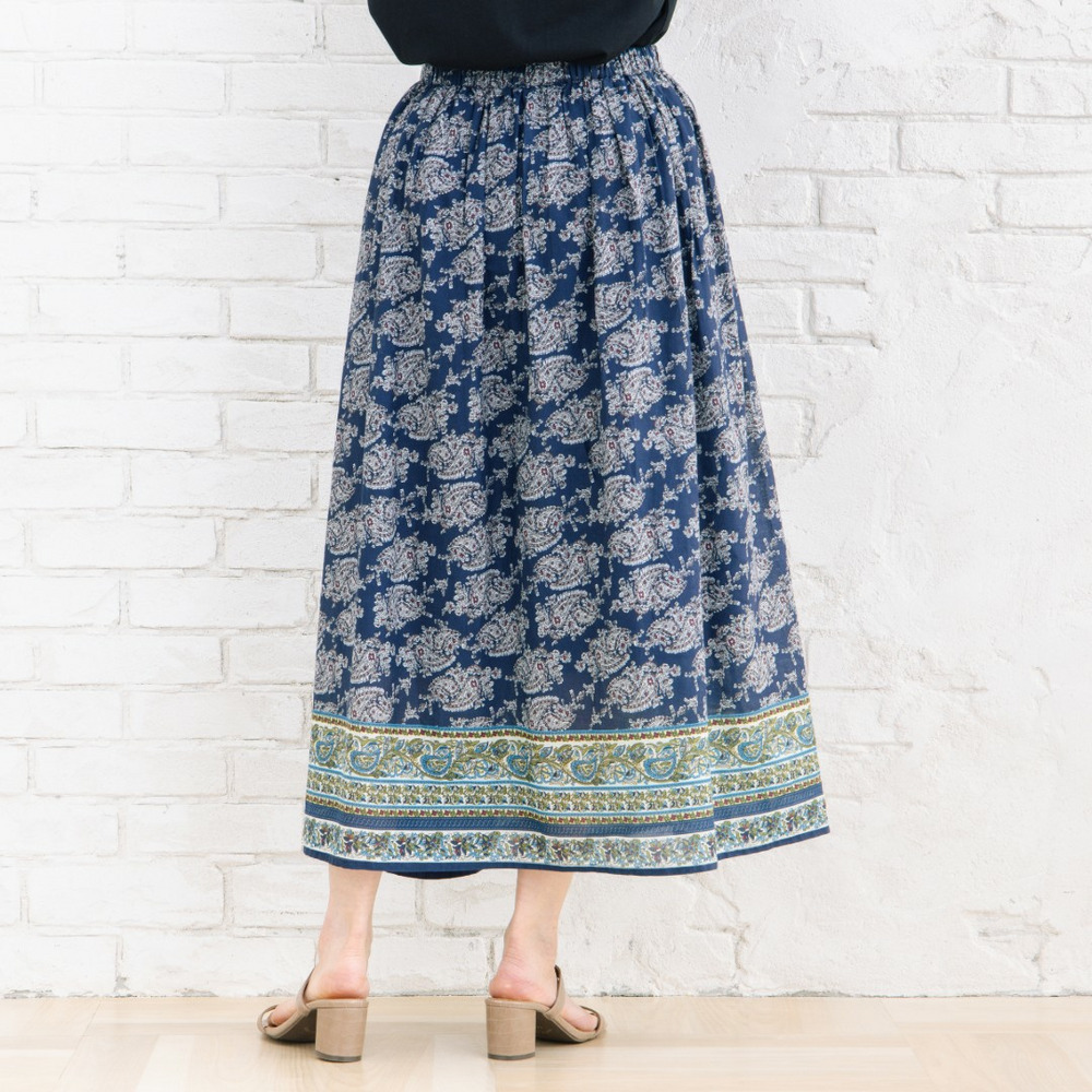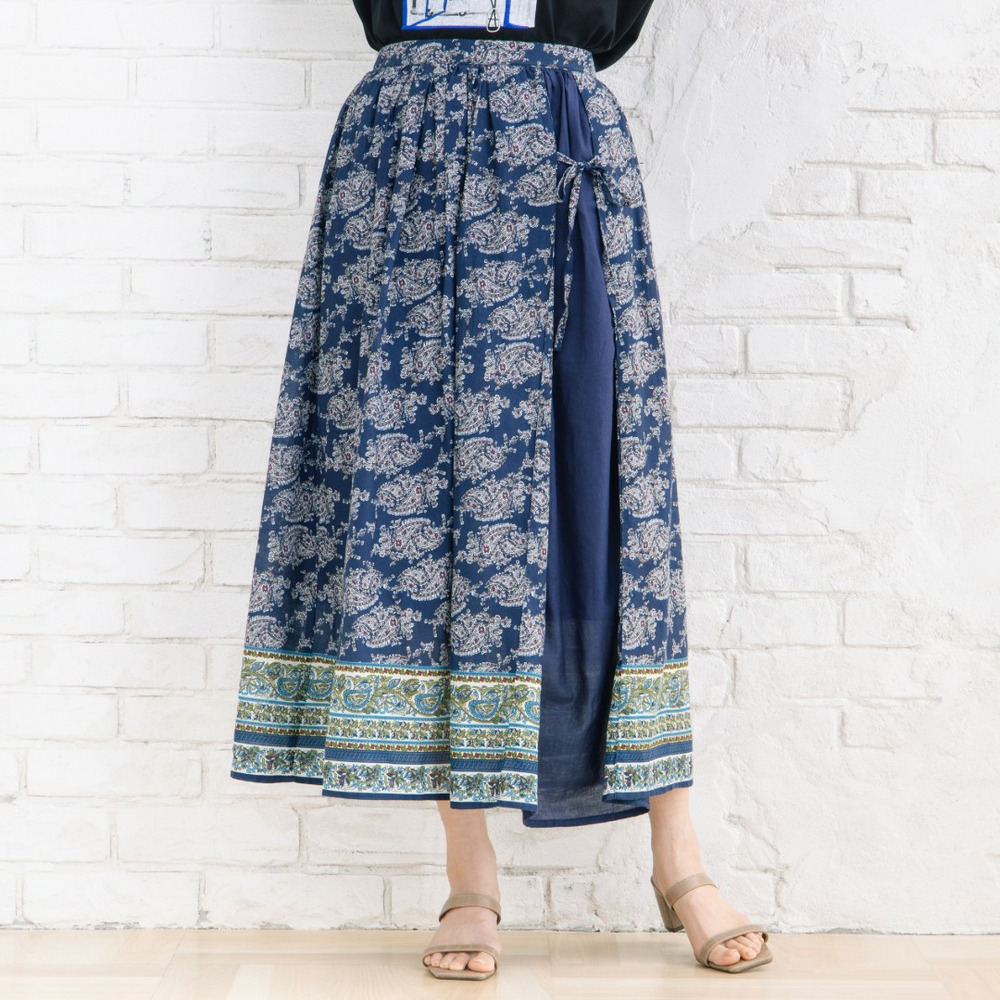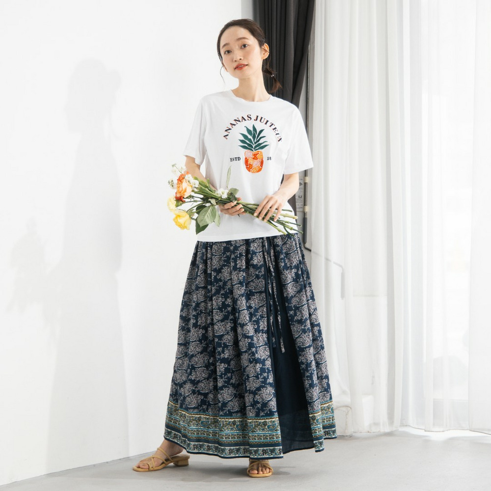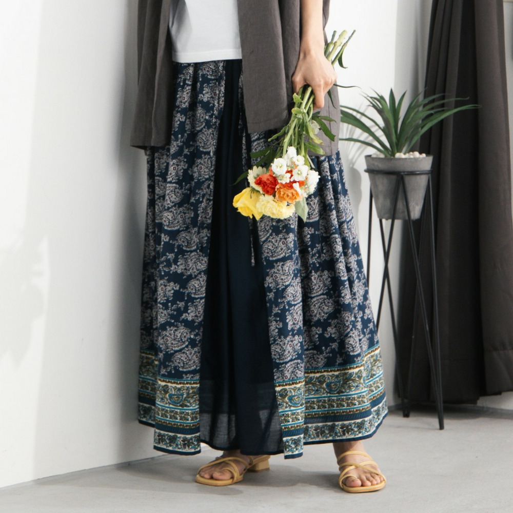 繊細なエスニックプリントが目を引く、存在感のあるロングスカート。