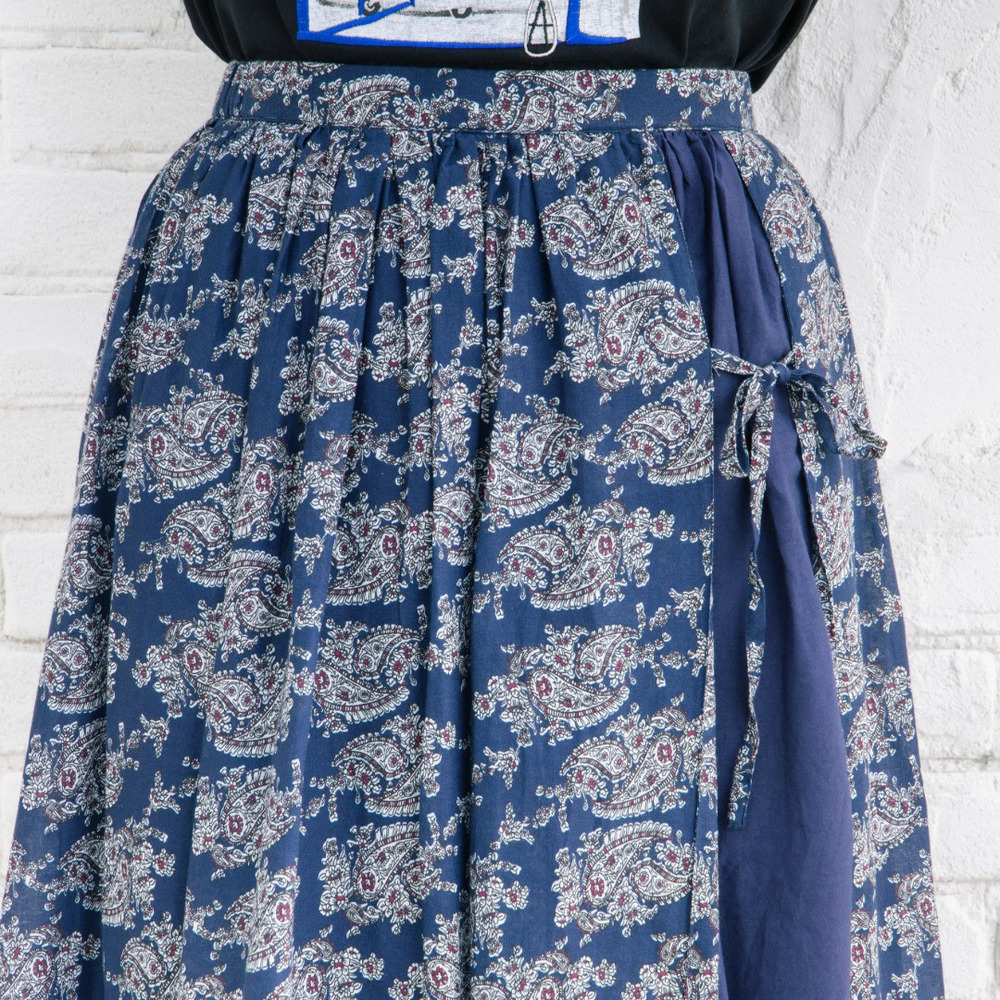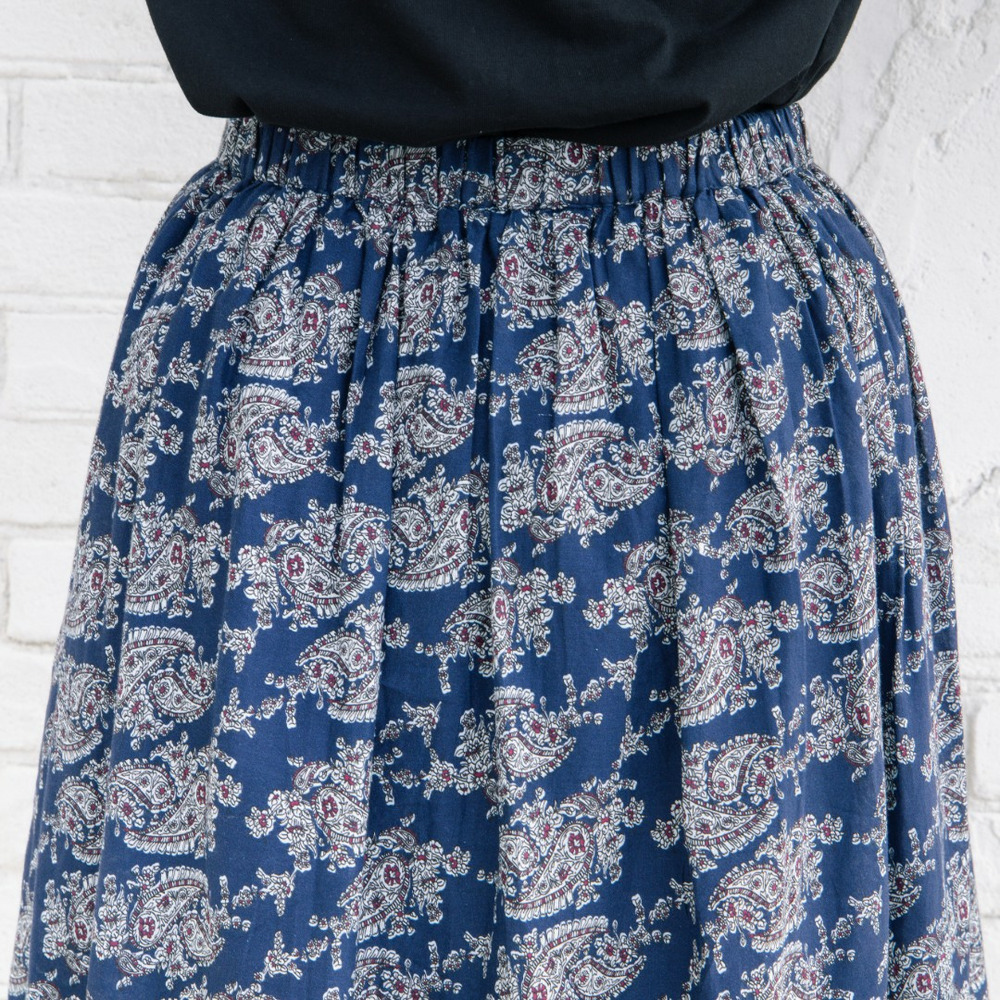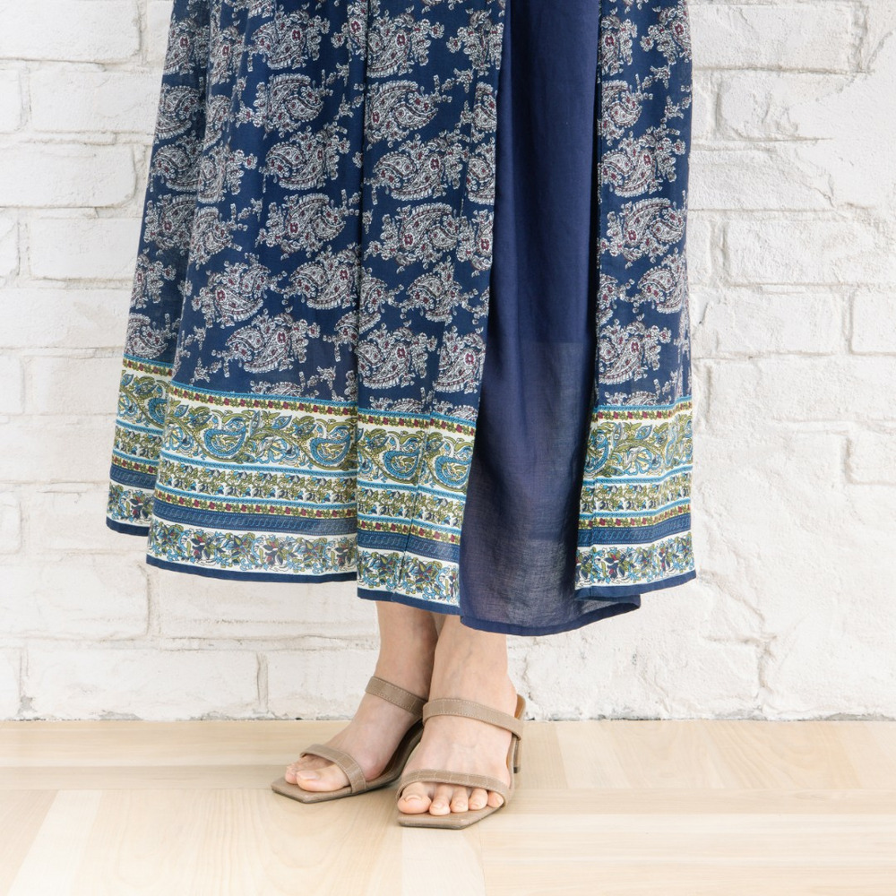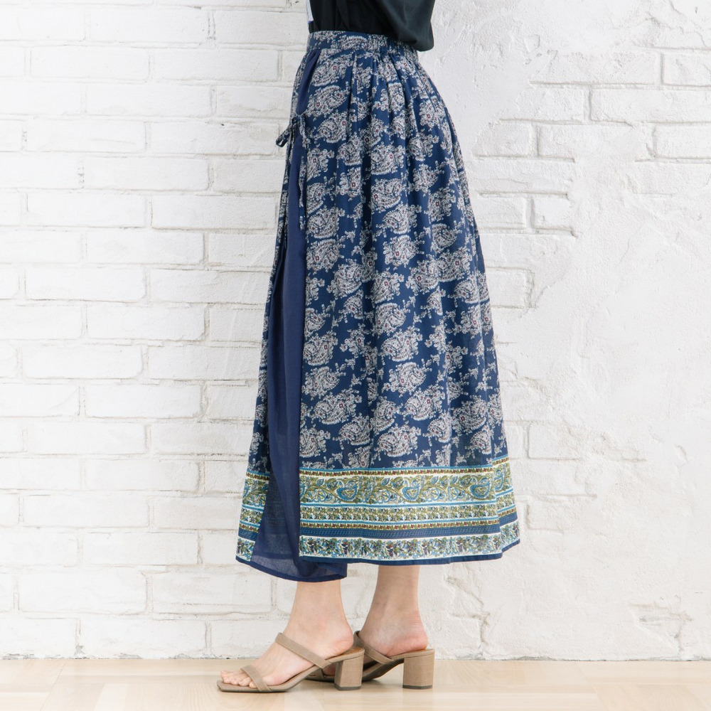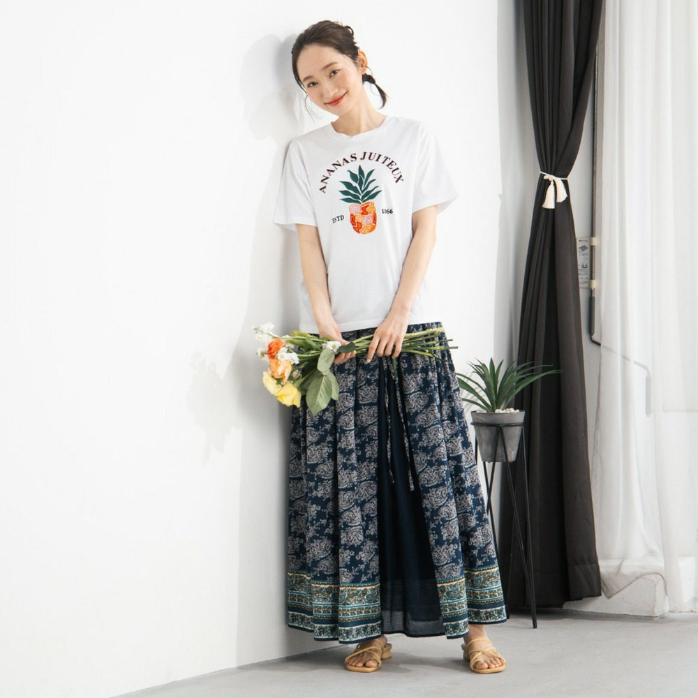 繊細なエスニックプリントが目を引く、存在感のあるロングスカート。