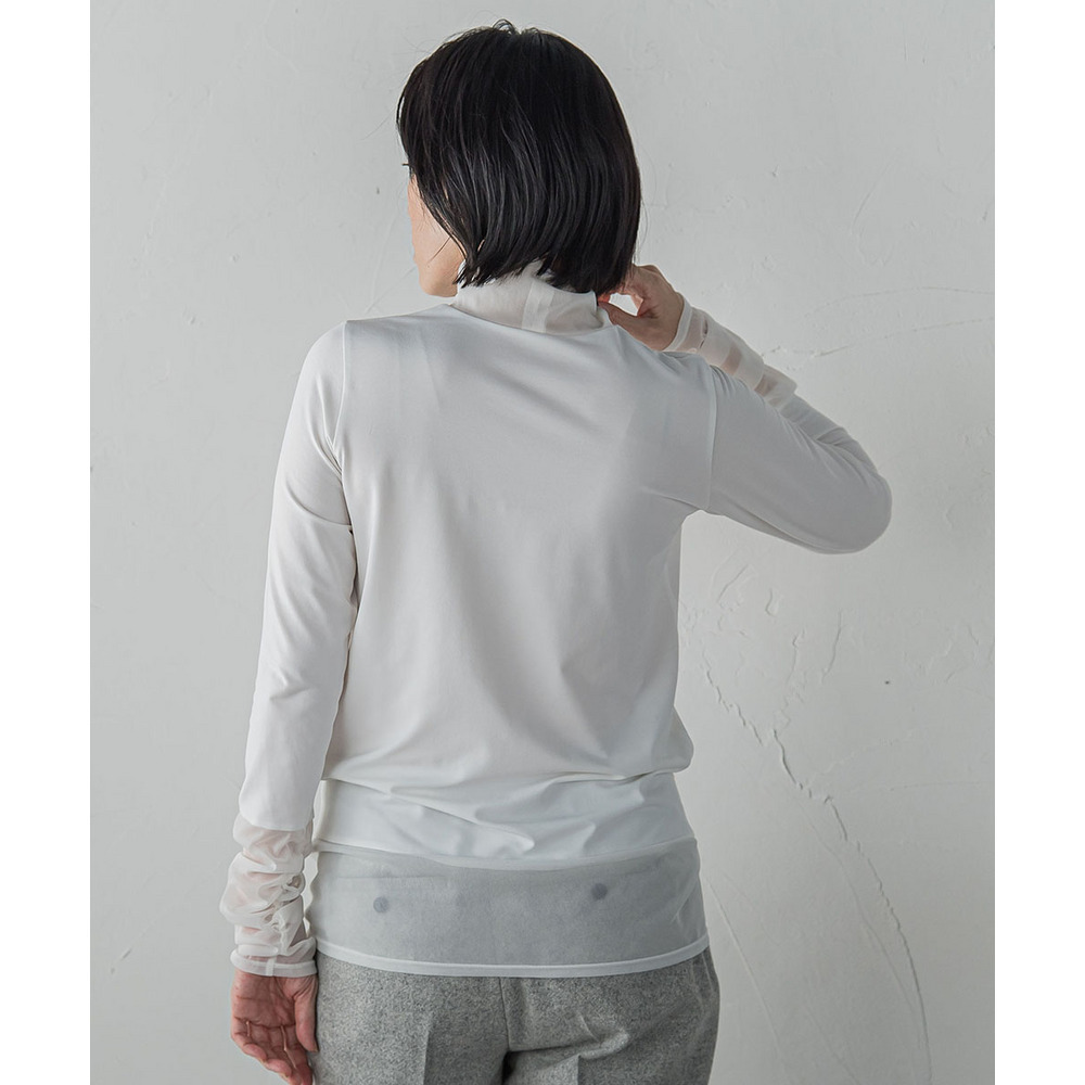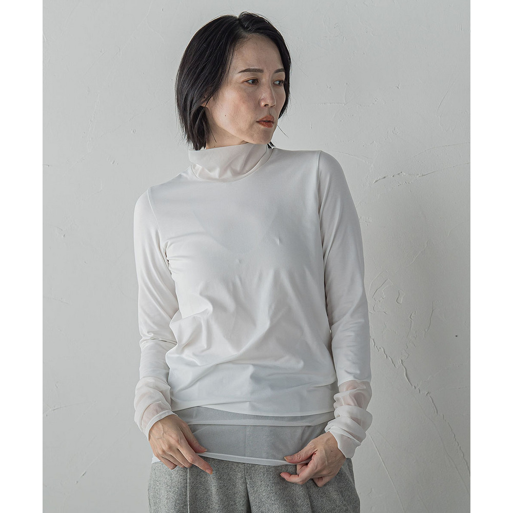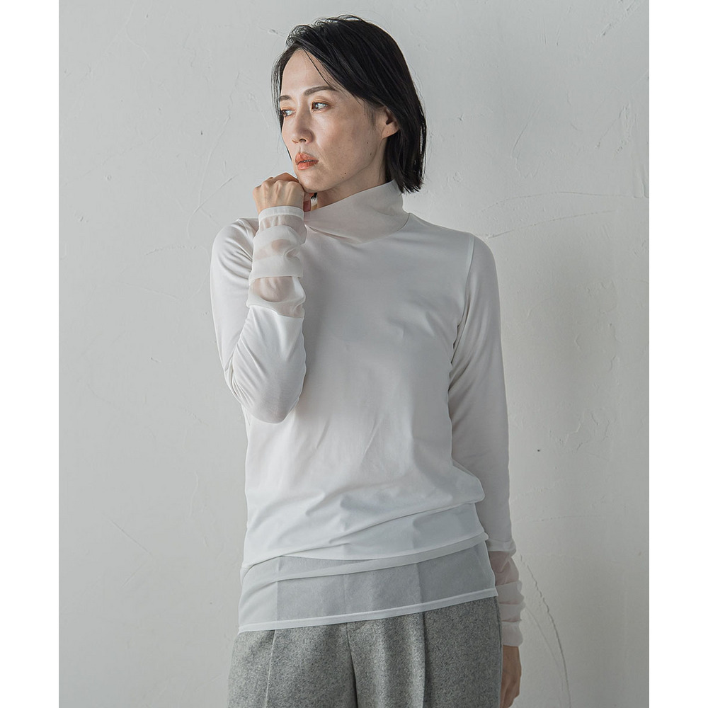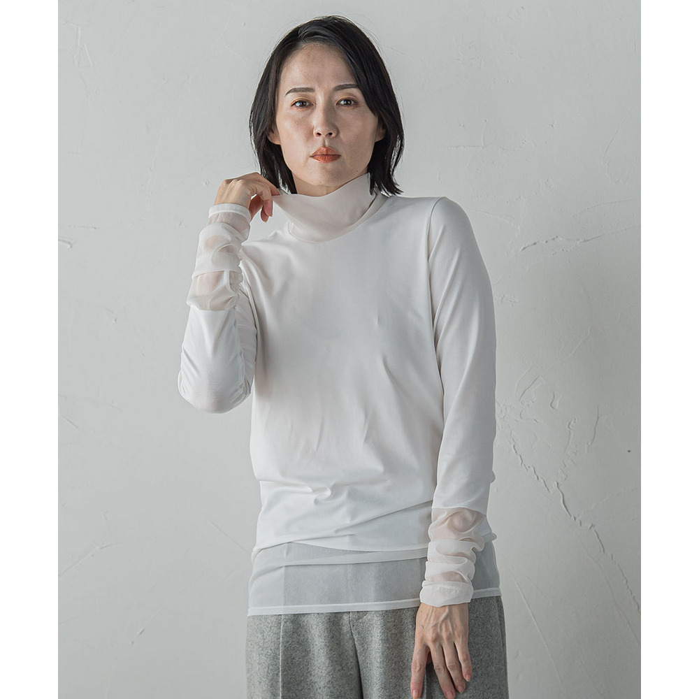 襟・袖口・裾にシアー素材をあしらった、インナーハイネックのカットソー。