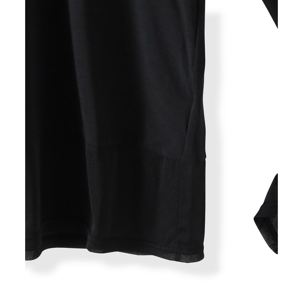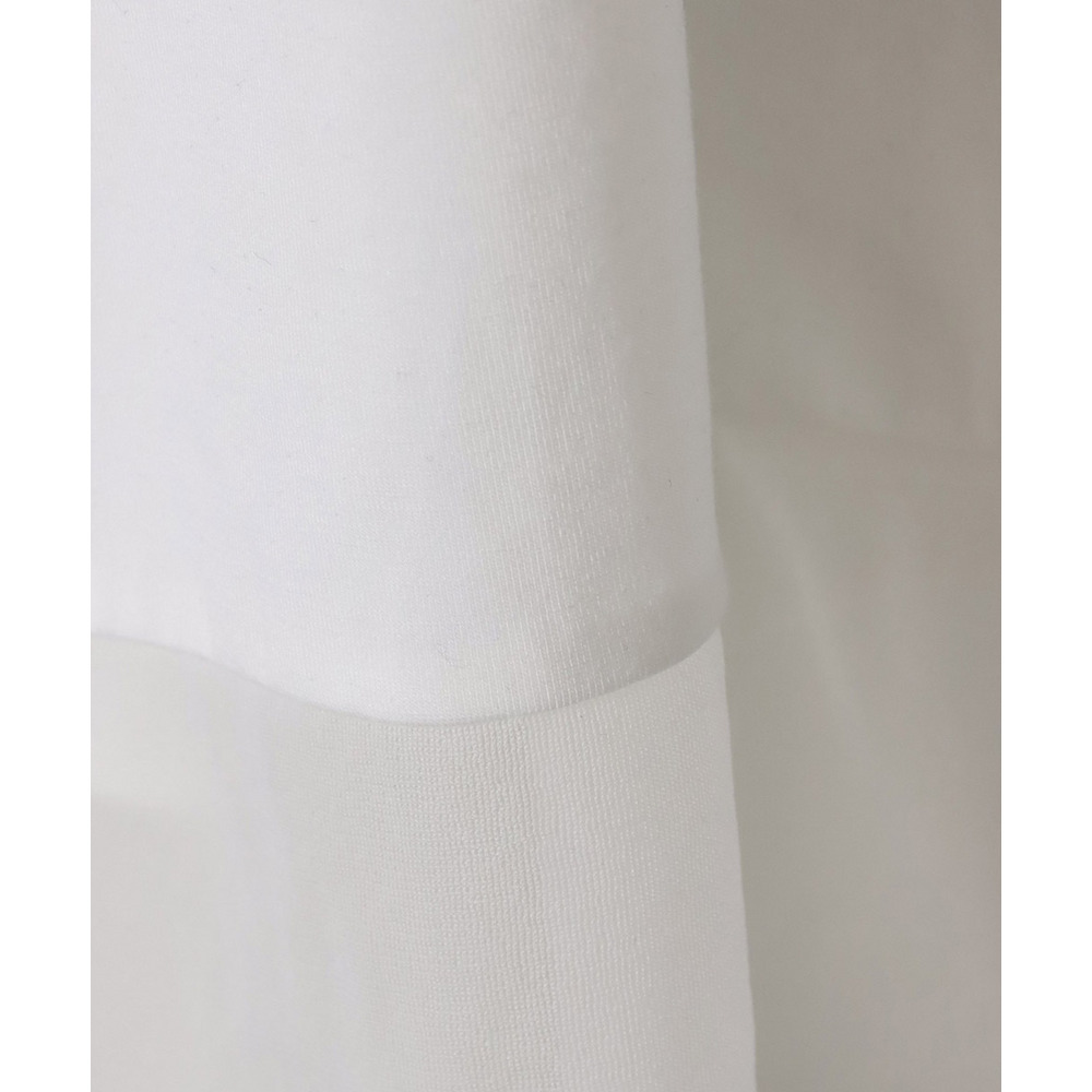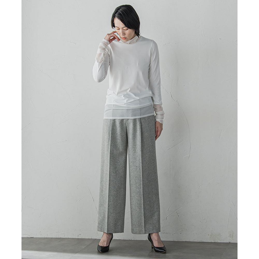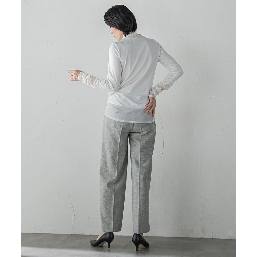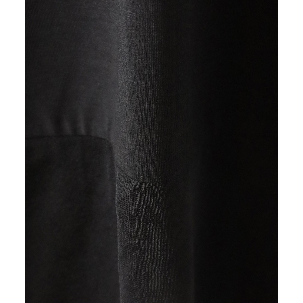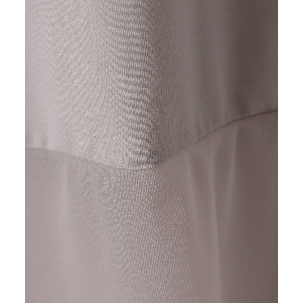 部分使いのシアー素材は、布帛のジョーゼット素材のような表面感を出したトリコット素材を使用し、適度な透け感とストレスフリーな着心地を実現しています。
