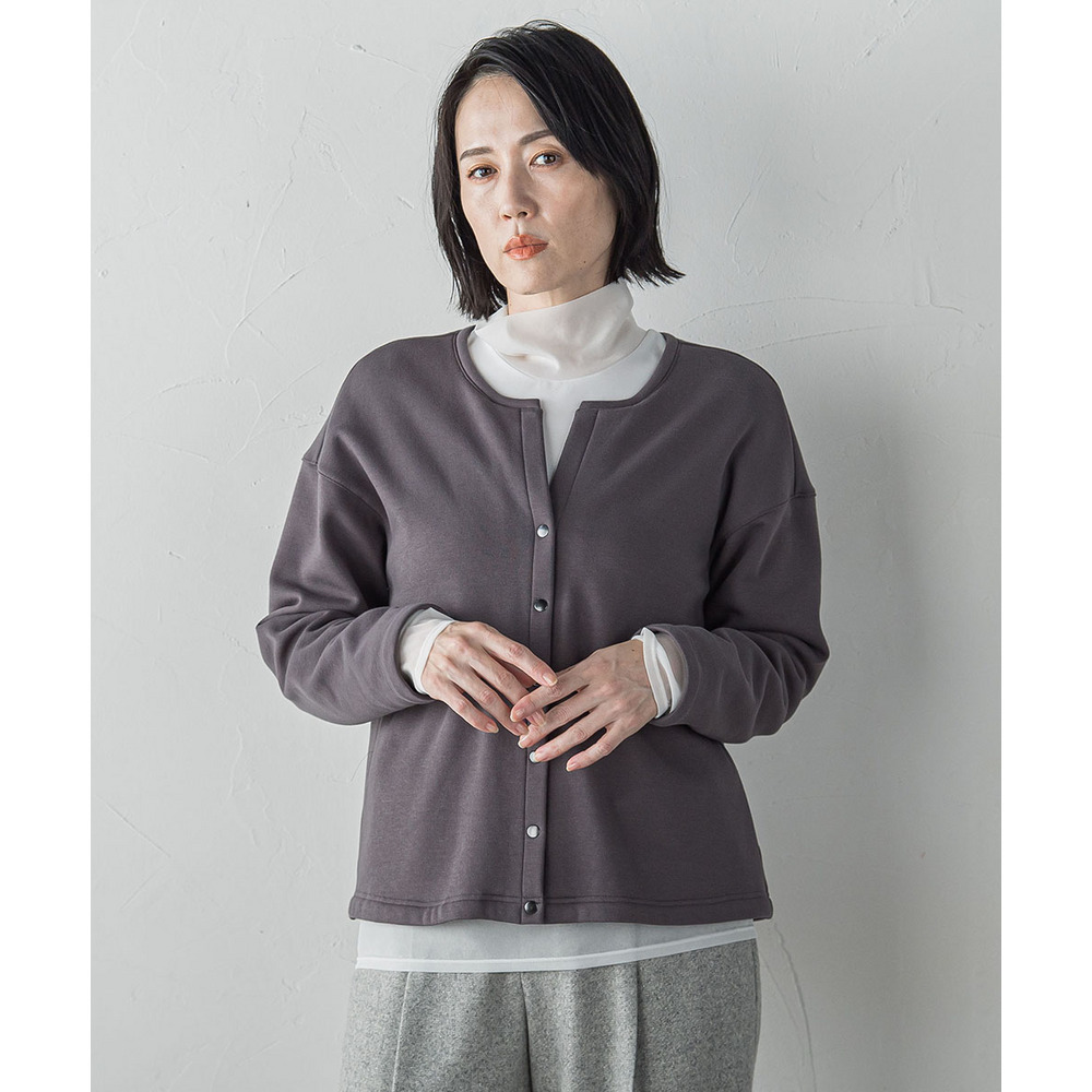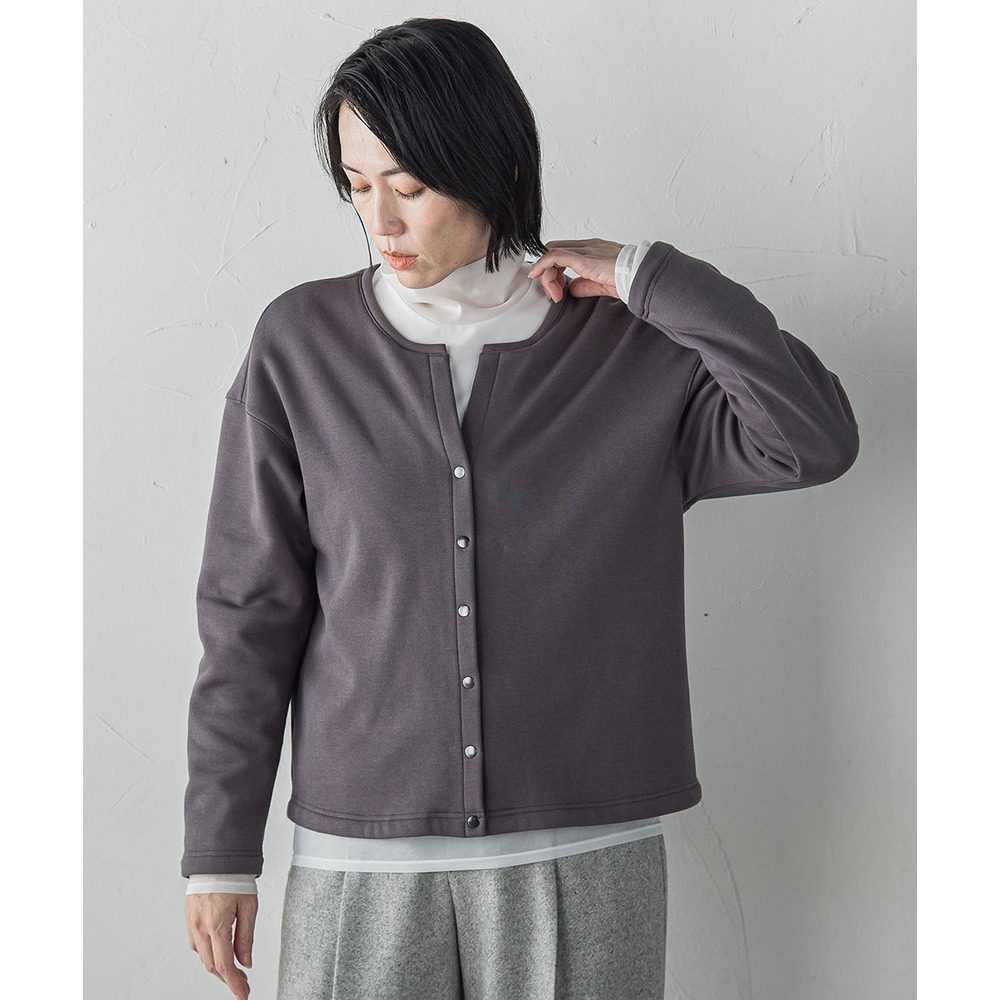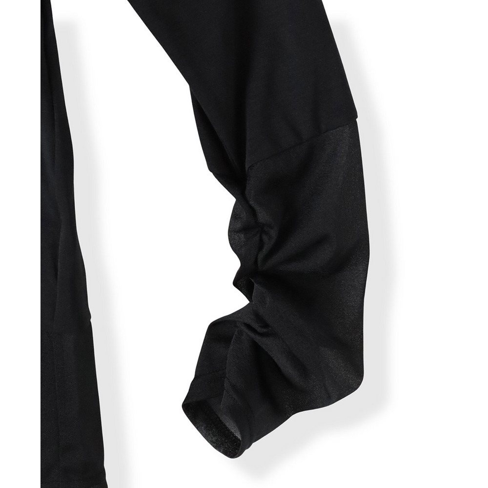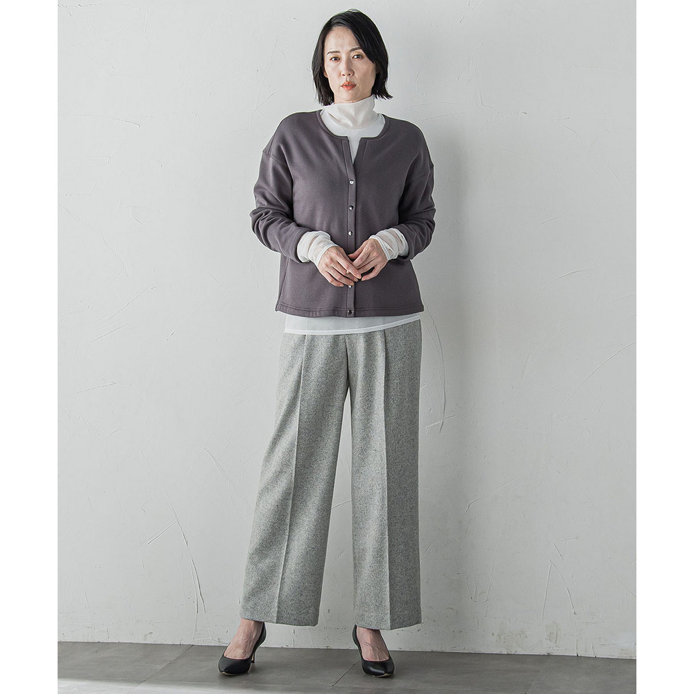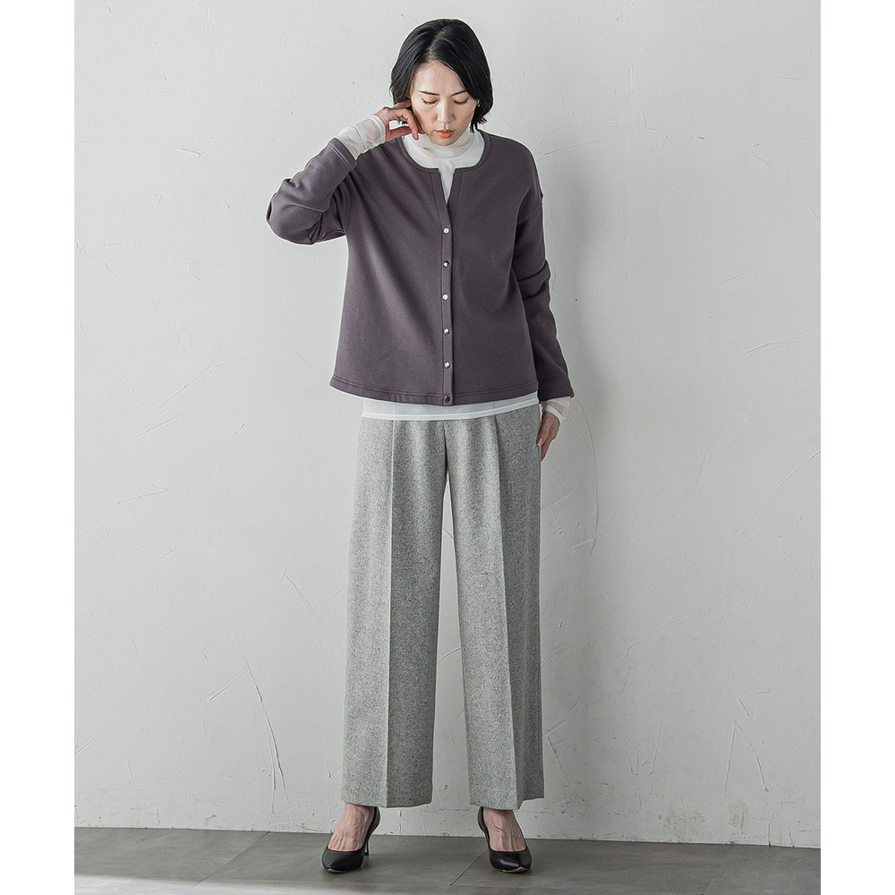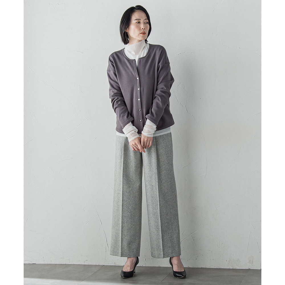 部分使いのシアー素材は、布帛のジョーゼット素材のような表面感を出したトリコット素材を使用し、適度な透け感とストレスフリーな着心地を実現しています。