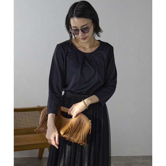 【洗える/清涼素材/吸水速乾/UVカット/ストレッチ/透け防止】高機能タック切替七分袖カットソー