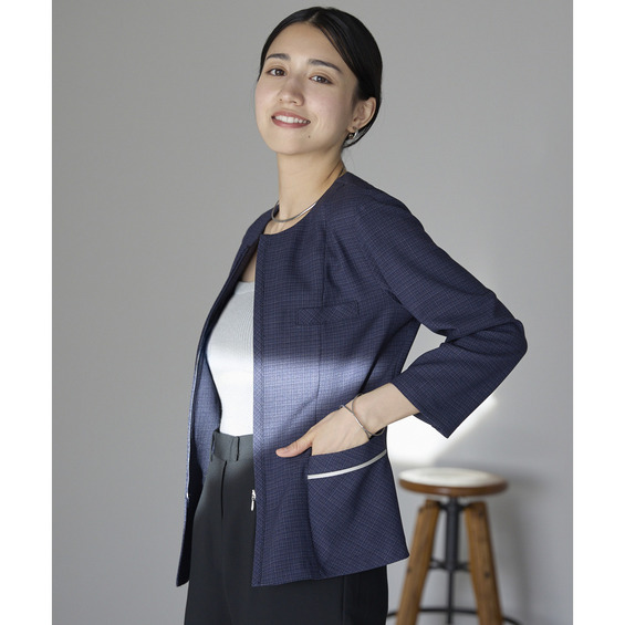 どんなスタイルにもマッチする万能ノーカラージャケットです。