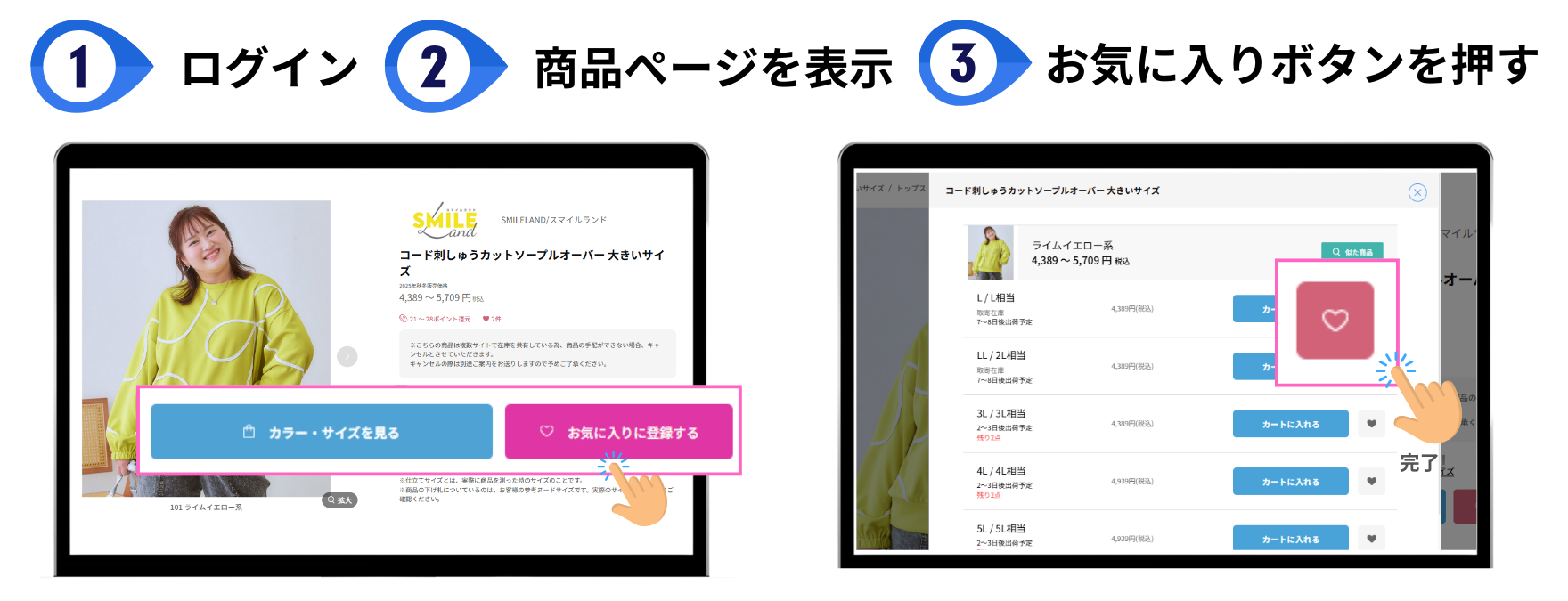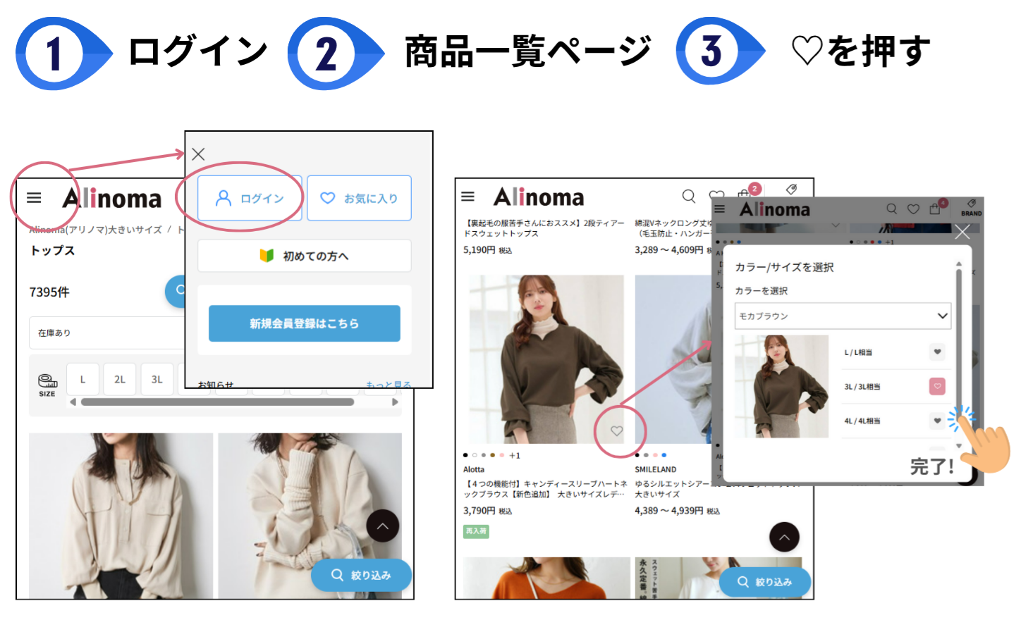 事前にログインのうえ、商品ページから♡マークをチェックしてください。
